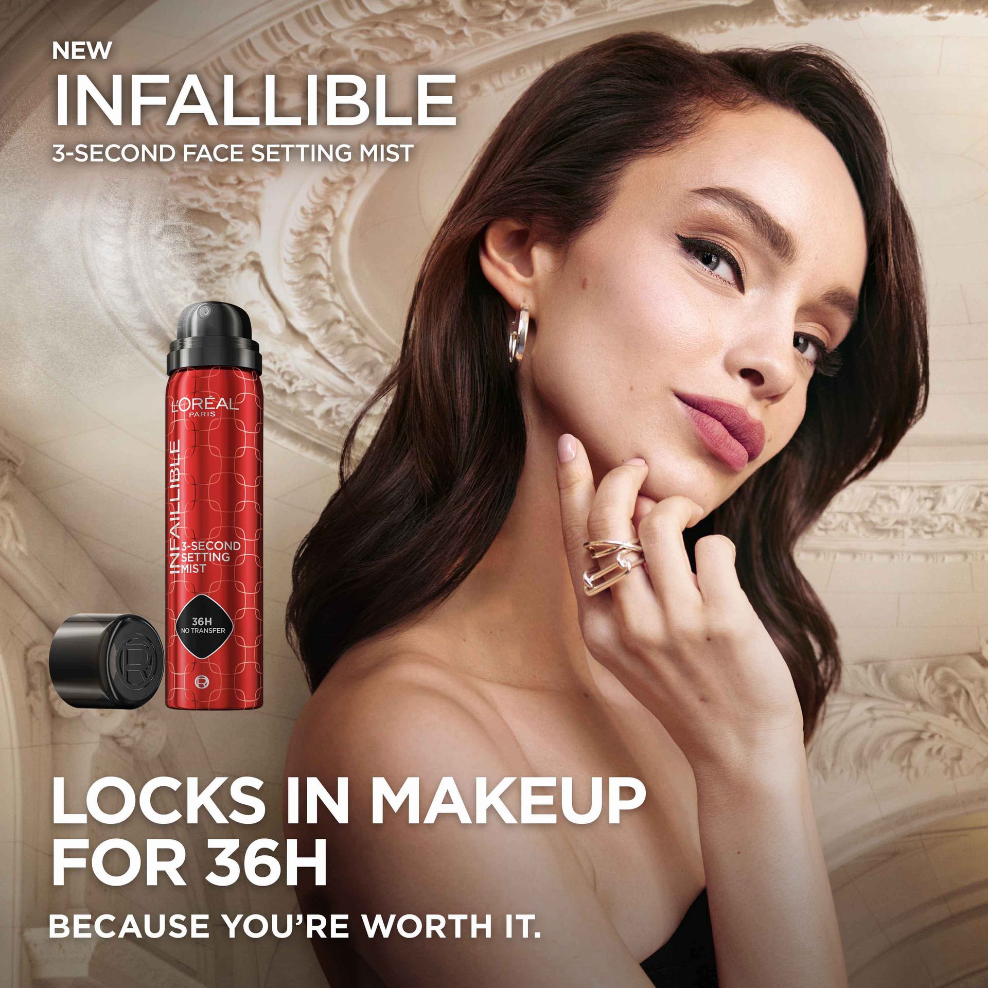 Discover Infallible 3-Second Setting Mist by L'Oreal Paris with a micro-fine mist for up to 36H wear in just one spray, a new professional-inspired aerosol format that instantly dries. Extend your make-up wear with a setting spray that holds it in place and prevents make-up transferring onto clothes or being compromised by rain or sweat. Experience a lightweight and breathable formula that feels comfortable on your skin.