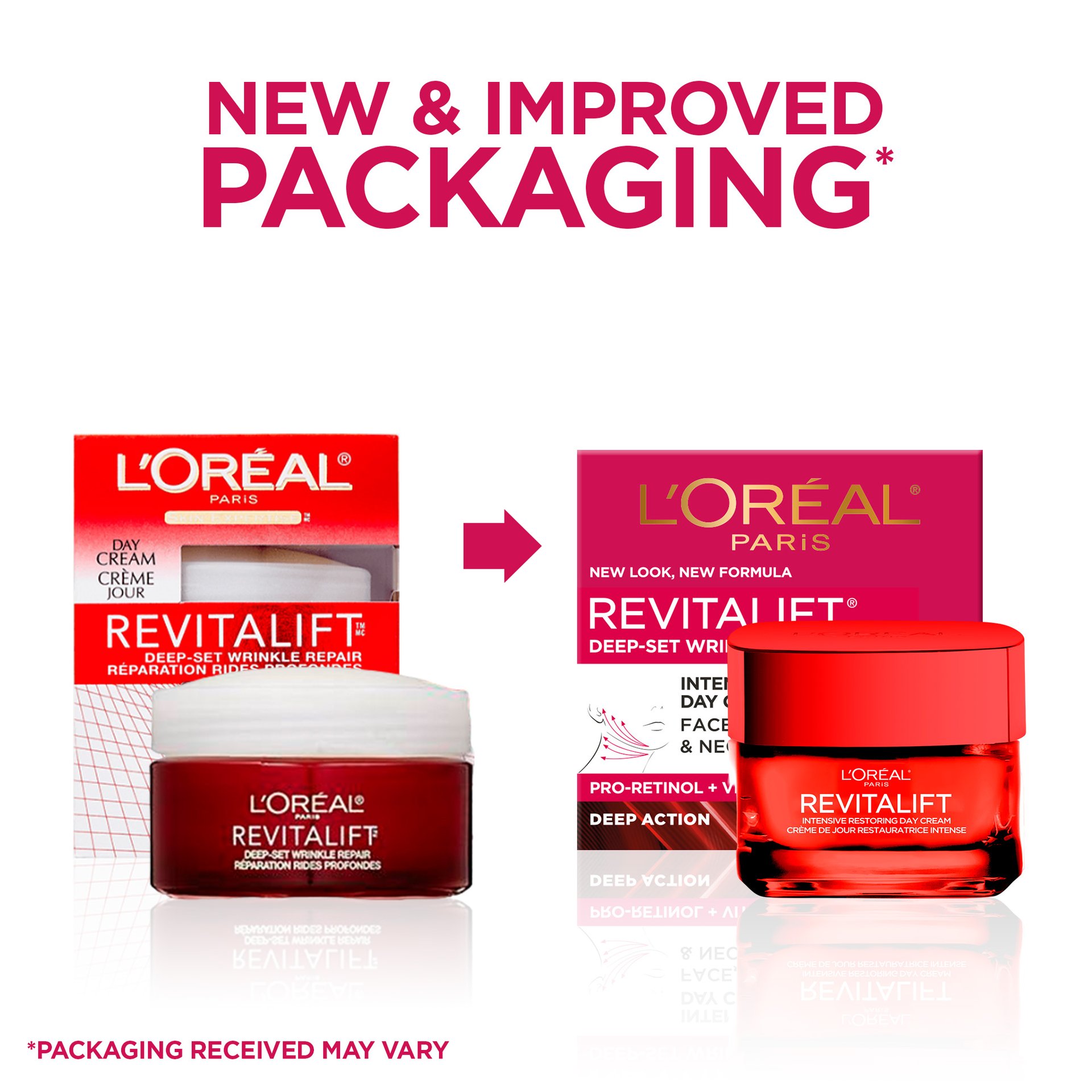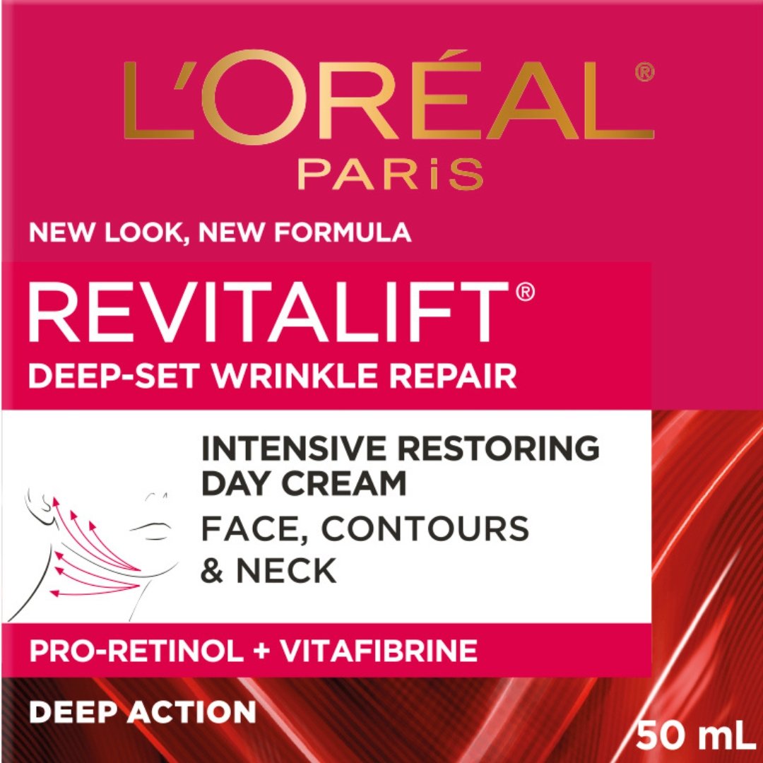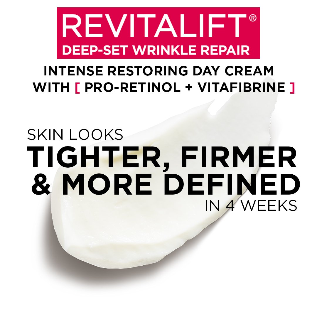 L'Oréal Paris Revitalift Deep-Set Wrinkle Repair Cream is an intensive restoring day cream for face, contours and neck that provides deep action targeting wrinkles. Formulated with powerful dermatologist-inspired ingredients. PRO-RETINOL to help smooth skin surface. VITAFIBRINE to help protect and improve skin elasticity. After one use, skin is more hydrated and toned. Over time, skin feels tighter, as is lifter. Skin seems younger and firmer and face contours look more defined.