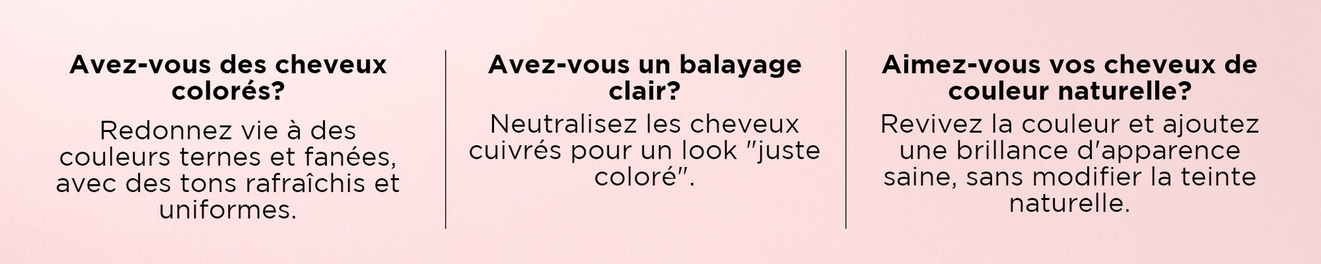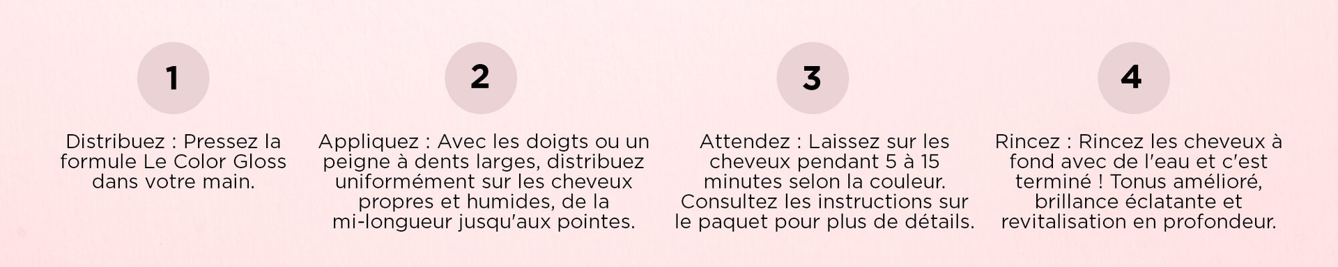 Apprenez tout ce que vous devez savoir sur Le Color Gloss et comment utiliser notre premier gloss rehausseur de tons à la maison, qui augmente la brillance, rehausse la couleur et revitalise en profondeur les cheveux en une seule étape.