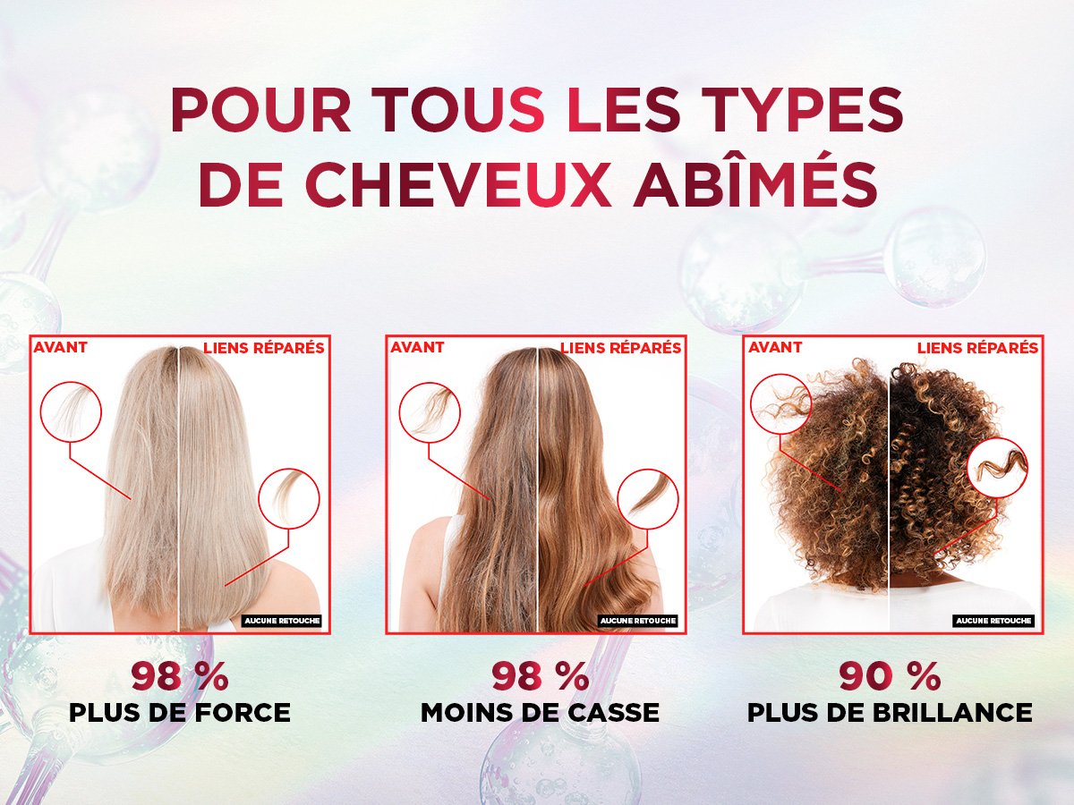 Les cheveux sont 98% plus fort, 90% plus brillants et 98% moins abîmés.