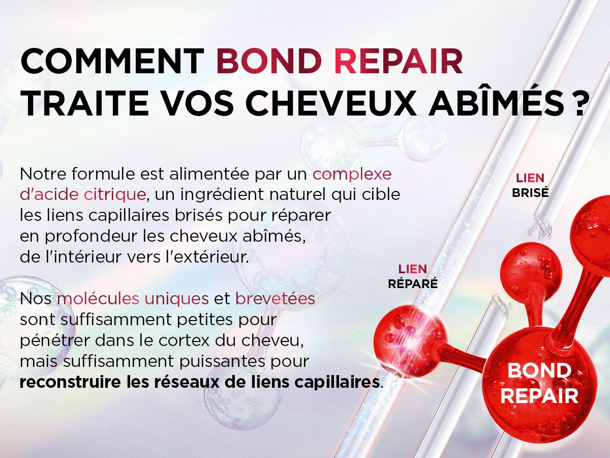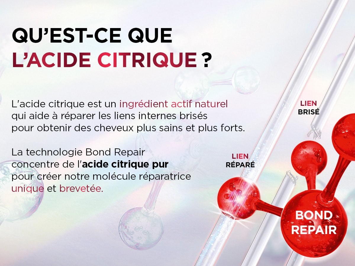 Un traitement de liens capillaires à l'acide citrique est votre meilleure solution lorsqu'il s'agit de traiter les cheveux abîmés. C'est pourquoi nous sommes fiers de vous présenter BOND REPAIR, notre technologie de réparation capillaire la plus performante à ce jour. Conçu pour tous les types de cheveux abîmés et les pointes fourchues, ce nouveau système de liaison répare les liens des cheveux abîmés et permet à vos cheveux d'être plus forts que jamais.