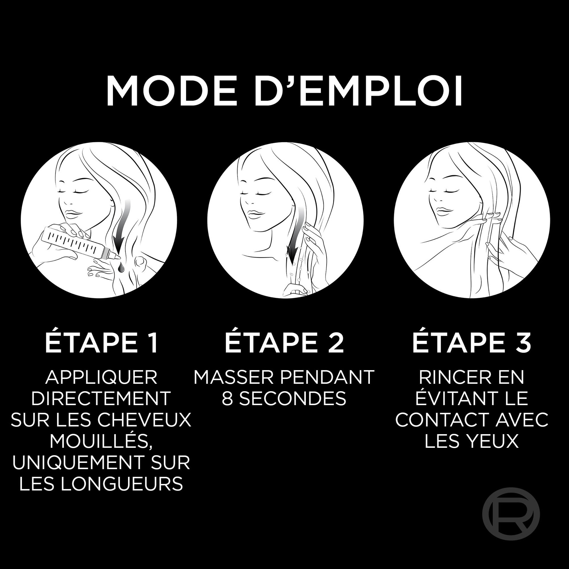 Sous la douche, appliquer directement sur les cheveux mouillés, sur les longueurs uniquement. Masser pendant 8 secondes. Rincer en évitant tout contact avec les yeux. Vous pouvez ressentir une légère sensation de chaleur lorsque le produit s'active. Poursuivre avec votre routine capillaire normale. Pour des résultats encore plus importants, faire suivre d'un brushing. Dosage : 1 dose = 20ml. 1 dose pour une texture fine à moyenne. 2-3 doses pour une texture épaisse à ondulée. Utiliser une dose supplémentaire si nécessaire pour les cheveux très longs.