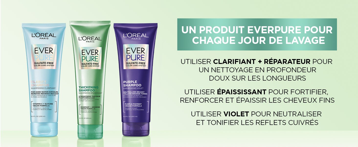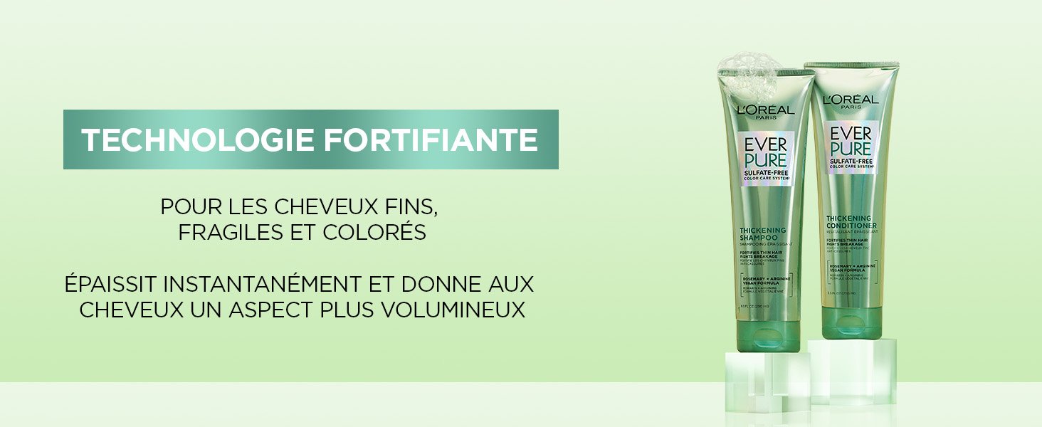 Le système EverPure épaississant sans sulfates: Pour des cheveux minces fortifiés et une réduction de la casse, utilisez le shampooing et le revitalisant EverPure épaississant sans sulfates en tandem.