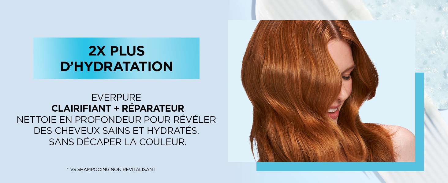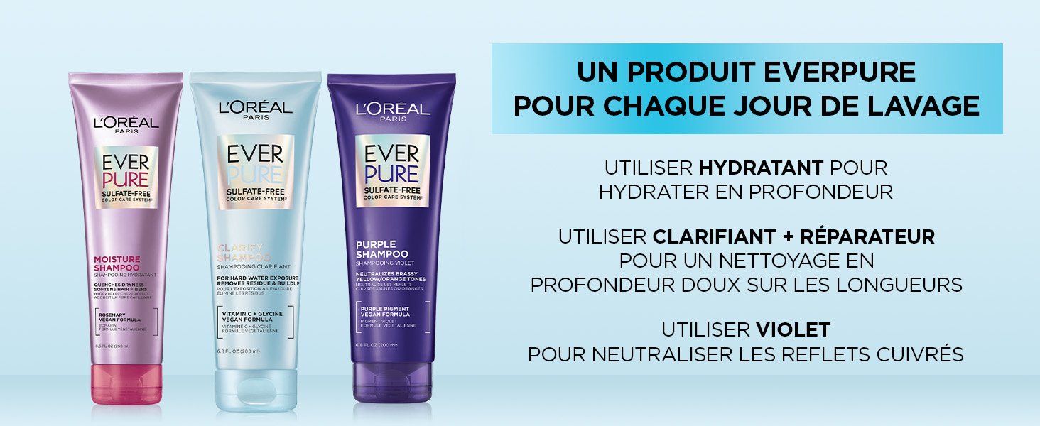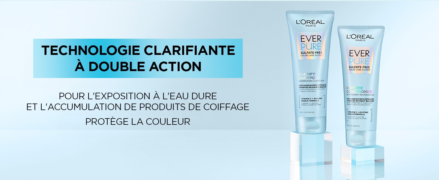 Shampooing clarifiant sans sulfates : Obtenez les cheveux les plus sains. Le shampooing EverPure clarifiant + réparateur est spécialement conçu pour éliminer les résidues d'eau dure et les accumulation de produits coiffants, apportant deux fois plus d'hydratation tout en protégeant votre couleur.