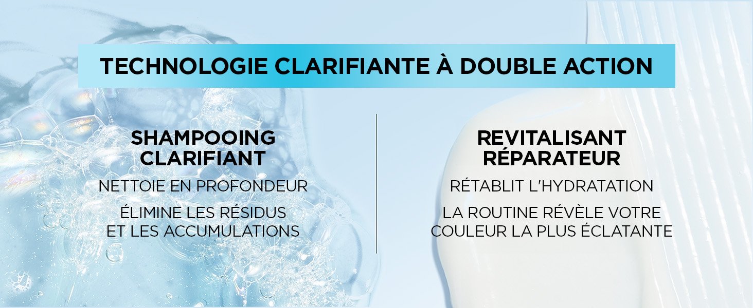 Soins de salon à domicile : Les cheveux exposés à l'eau dure et à l'accumulation de produits coiffants nécessitent des soins particuliers. Formulé avec une technologie clarifiante double action à base d'antioxydants, de vitamine C et de glycine pour nettoyer en profondeur et rétablir l'hydratation, laissant les cheveux plus propres, plus sains et plus nourris.