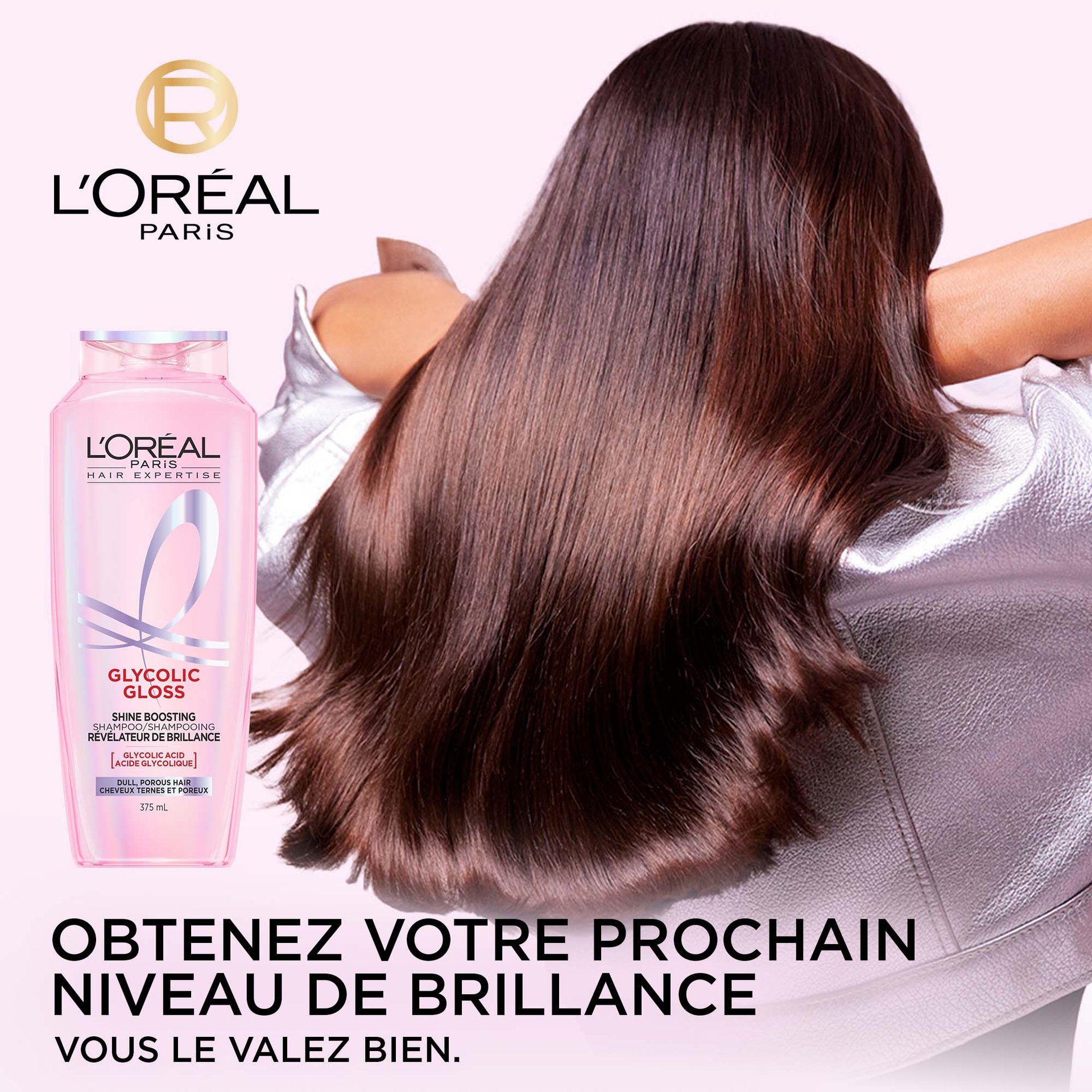 Des cheveux plus brillants : enrichi en acide glycolique. Notre formule recouvre la cuticule du cheveu d'un vernis brillant instantané.