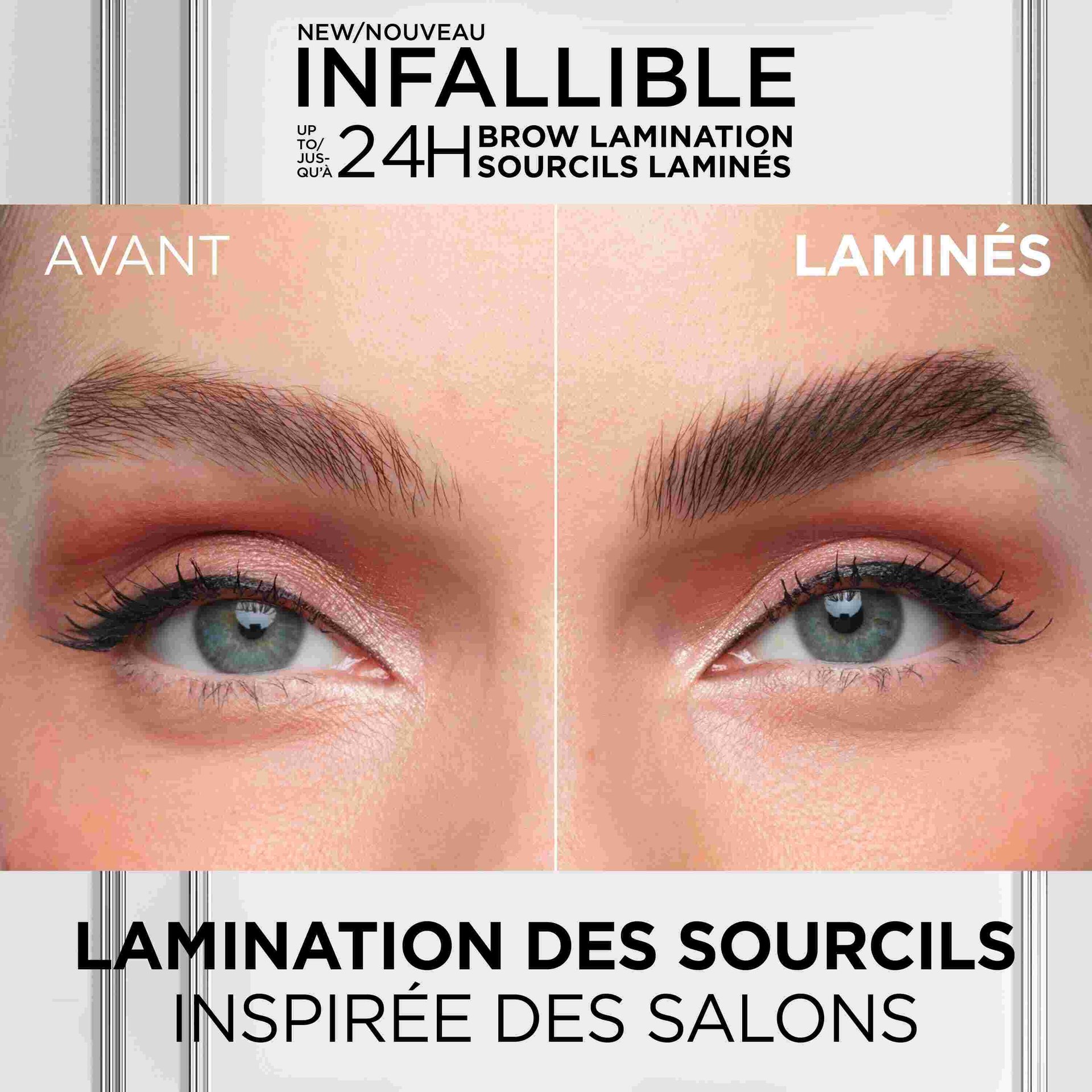 Liftez et laminez vos sourcils à la maison avec le nouveau gel de lamination pour sourcils Infallible 24H de L'Oréal Paris, qui offre une tenue maximale pouvant durer jusqu'à 24 heures. L'applicateur unique en forme de brosse angulaire facilite l'application et la création de la forme parfaite des sourcils. La formule est légère, ne laisse pas de résidue et convient à tous les types de textures de sourcils.