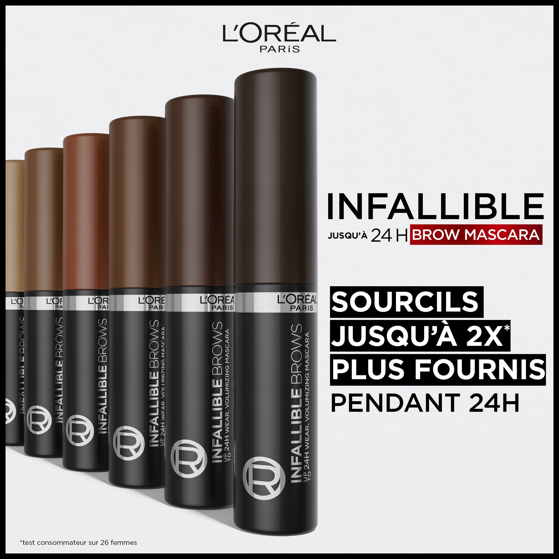 Découvrez le Mascara Volumisant pour Sourcils Infallible 24H pour révéler les sourcils que vous ne saviez pas que vous aviez. Composé d'une formule chargée en fibres, ce mascara pour sourcils adhère aux poils pour révéler des sourcils jusqu'à 2x* plus fournis et tient jusqu'à 24 heures. Sa brosse micro-agrippante permet une application précise pour attraper et dompter les poils, quel que soit votre type de sourcil. Disponible en 7 teintes Infallible. Êtes-vous prêt(e) à passer de zéro à sourcils en un seul coup ?