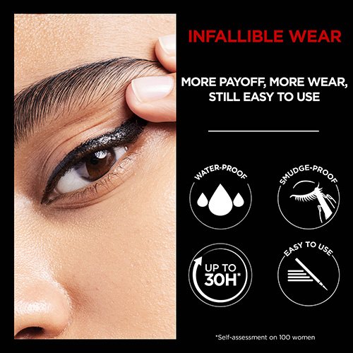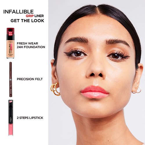 Dure jusqu’à 30 heures. Application facile. Hydrofuge. Anti-bavures. Un trait qui définit l’œil avec une couleur vive et durable. Le traceur liquide précis à pointe feutrée Infallible Grip de L’Oréal Paris glisse sans effort sur la paupière pour créer un trait précis, sans bavures, qui dure jusqu’à 30 heures. Offert en cinq nuances, vous pouvez trouver une couleur aux pigments ultra-intenses pour réussir un look classique ou audacieux.