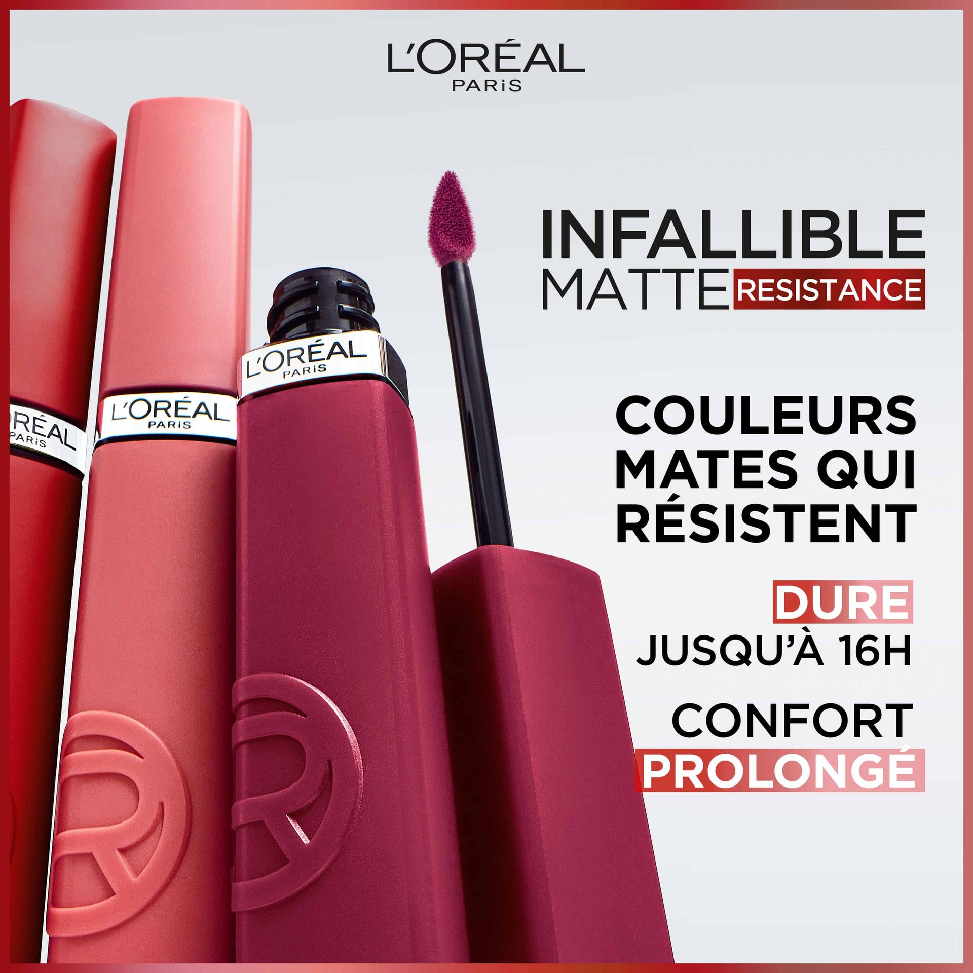 Les couleurs mates du rouge à lèvres liquide Infallible Matte Resistance résistent à tout. Mais pouvez-vous résister ? Ce rouge à lèvres offre à vos lèvres un fini mat poudré de 16h et un fort impact couleur. Avec sa formule infusée d'acide hyaluronique, vous bénéficiez d'une sensation de douceur ultra-confortable tout au long de la journée. Sa texture ultra fine et son applicateur pelucheux facilitent également l'application. Obtenez une couleur intense en un seul coup. Résistant au transfert, au frottement et à l'eau, il ne s'écaille pas et ne fait pas de plumes. Disponible en 12 nuances irrésistibles.
