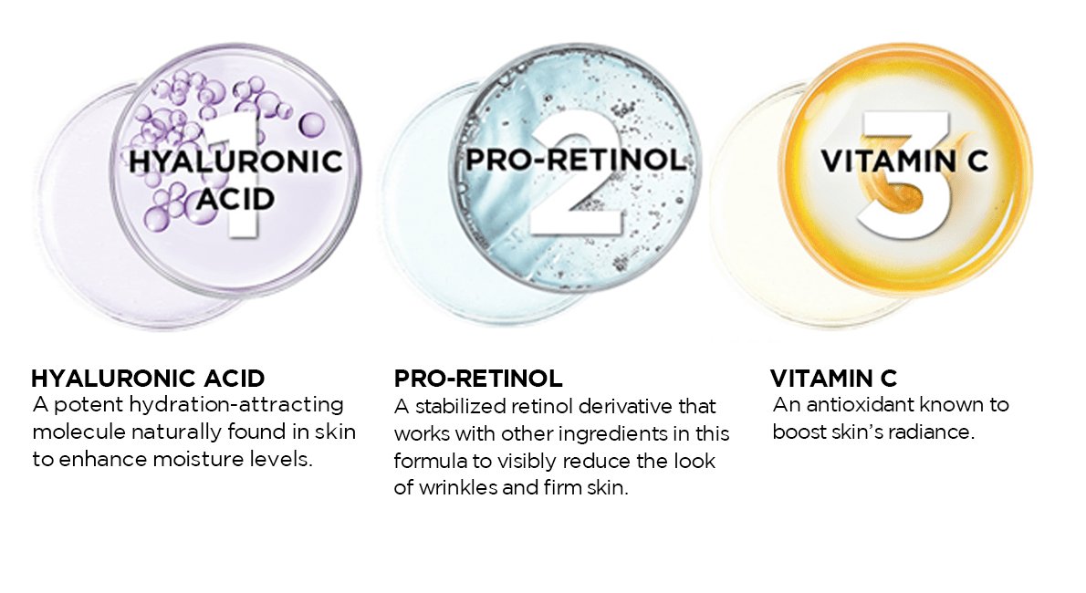 Avec 3 ingrédients puissants: Pro-Rétinol, Acide Hyaluronique et Vitamine C.