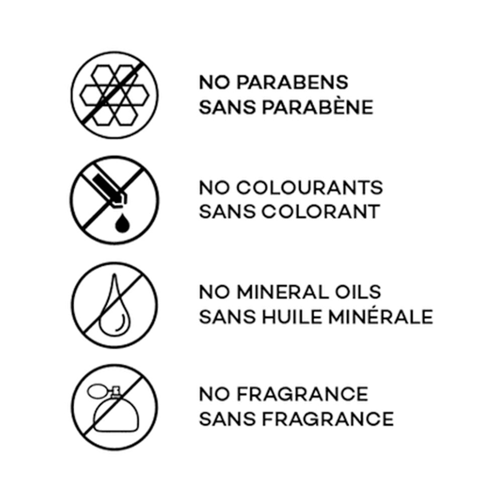 Sans parfum, sans parabènes, sans huiles minérales, sans colorant et convient aux peaux sensibles.