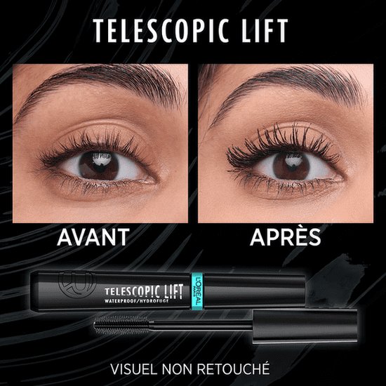 Le nouveau mascara anti-bavures Telescopic Lift de L'Oréal Paris apporte vos cils au prochain niveau. Grâce à notre toute première brosse double-face exclusive, ce mascara épaississant soulève vos cils et les fait paraître 5 mm plus longs. Volume instantané et 36 heures de beauté du maquillage des yeux garantis.